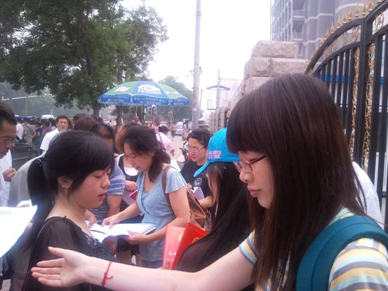 郭忠臣老师和李娟老师向求职者分发宣传材料