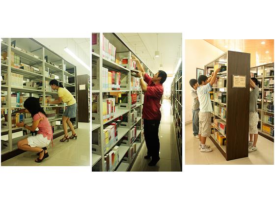 整理书籍原本是一件很累很枯燥的活儿,但是这一群对母校充满依恋的民商2005级党员们却把它演绎成为一份对母校的依依的恋情,一份对老师的深深的敬意,一份对学弟学妹的浓浓的关爱:遇到近距离的书架,他们就从架缝儿中找最短的途径传递,分组轮流着干,遇到远距离的书架,他们会全体参与,自觉有序的排成长队,轮流搬,来回的路上,彼此相视一笑,充溢温馨与趣意。