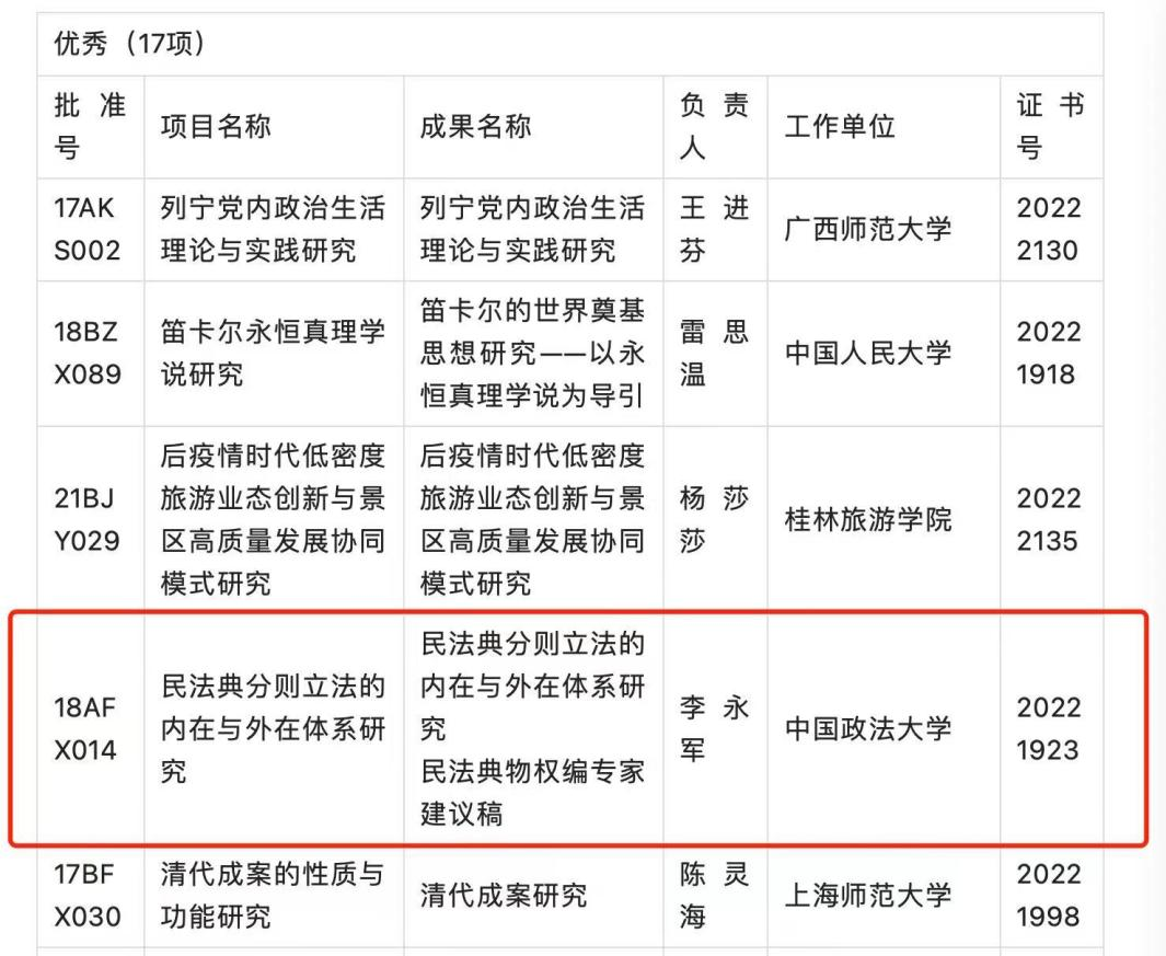 全国哲学社会科学工作办公室网站近期公布了2022年6月份的国家社科基金年度项目、青年项目和西部项目结项情况。本次共验收361个项目结项申请,经同行专家鉴定后,有301个项目予以结项;57个项目暂缓结项,3个项目被终止。在结项项目中,被评为“优秀”的共17项,其中李永军教授主持的重点项目“民法典分则立法的内在与外在体系研究”(项目编号:18AFX014;结项证书号:20221923)是唯一获此殊荣的法学项目。